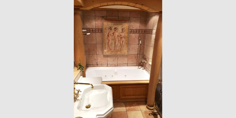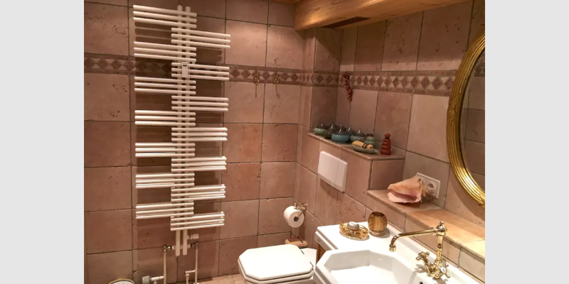 Auch im Souterrain finden Sie ein Bad. Großzügig gestaltet und mit Badewanne. Der Raum ist ebenfalls erstklassig ausgestattet: mit Marmorfliesen, vergoldeten Armaturen, Handtuchwärmer und Fußbodenheizung.