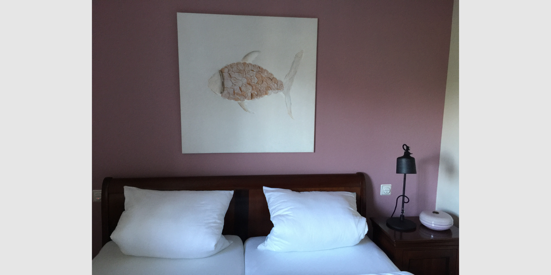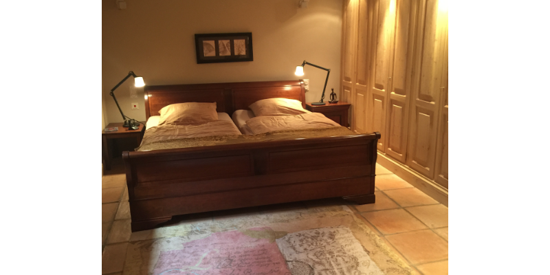 Vom Flur gelangen Sie auch in ein Schlafzimmer mit großem Doppelbett (180 x 200 cm lang) der französischen Marke Grange und hochwertigen neuen Matratzen. Tanken Sie neue Energie – wunderbar gebettet.
