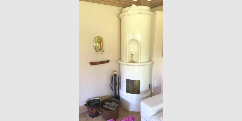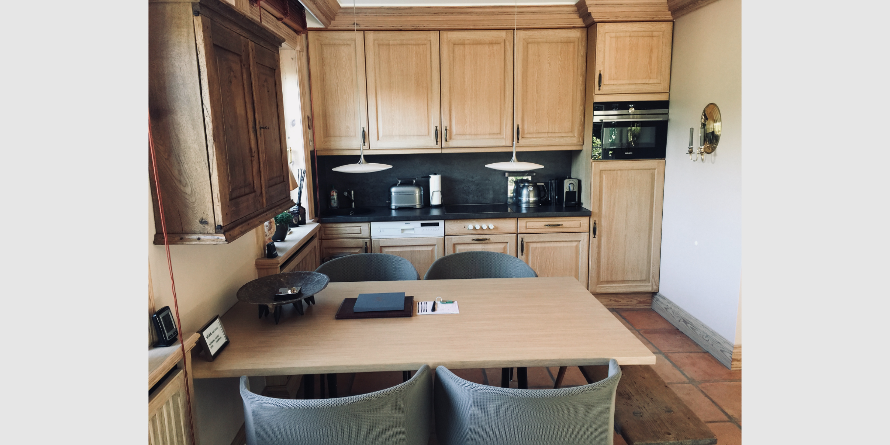 Im Erdgeschoss empfängt Sie nach einem Gang durch den Flur ein großzügiger und lichtdurchfluteter Wohnraum. Mit einer hochwertigen Einbauküche und einer separaten Essecke für 5 Personen. Dazu ein komfortables Loungesofa – gemütlich neben einem antiken Kachelofen. Ein wunderbarer Ort zum Verweilen.